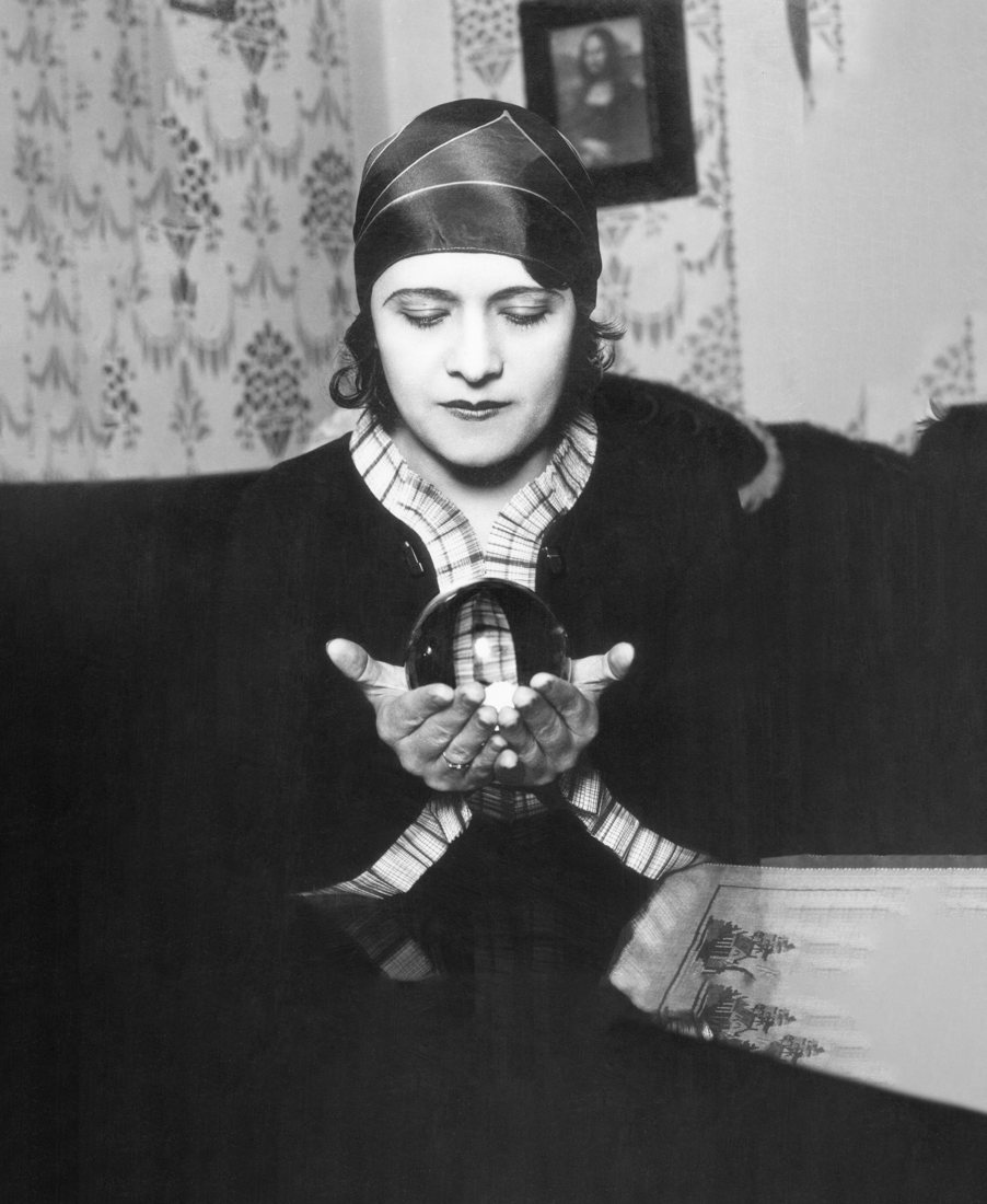 El segundo apartado, “Clarividencia”, recorre visualmente prácticas como la cartomancia y la quiromancia, donde la lectura del tarot o de la mano aparece como una forma simbólica de interpretar la identidad y el destino.